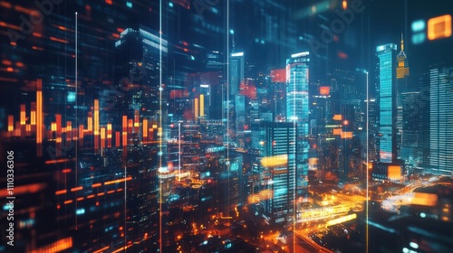 The vibrant skyline of Hong Kong lights up the night with its towering skyscrapers reflecting city life, while digital graphs overlay the scene, indicating market insights.
