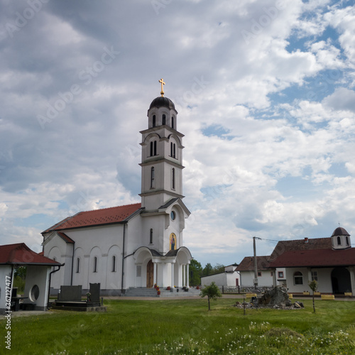 The village church in Bosanski Lužani dedicated to All Saints against the cloudy sky during the day. A temple building of simple architecture.