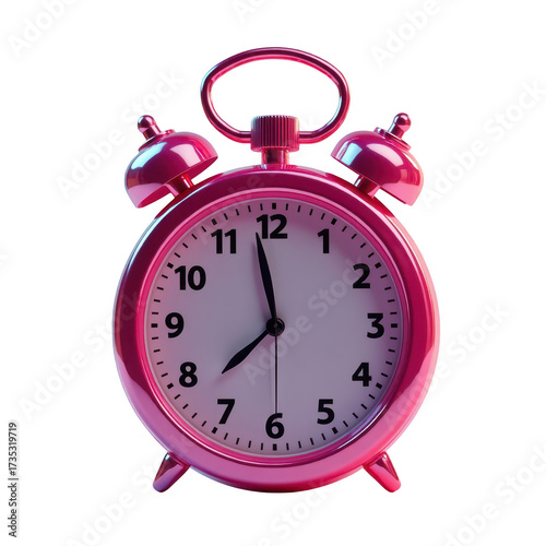 The vivid pink alarm clock stands out prominently against a stark black background, showcasing a glossy metallic sheen and a classic design with its prominent bells and dial.