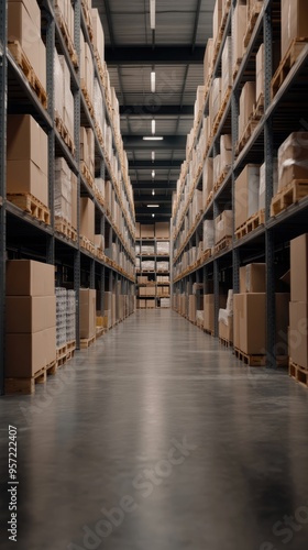 The warehouse is filled with shelves stacked high with electronic components and boxes. Overhead lighting creates a soft glow, highlighting intricate details of the items