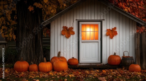 The white house glows warmly from inside, nestled among vibrant autumn leaves, scattered pine cones, and a solitary pumpkin on a rustic wooden surface