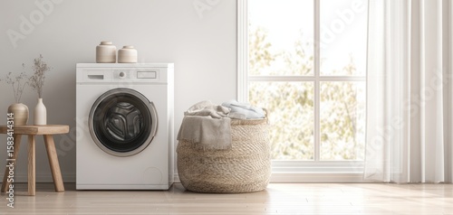 The white washing machine in a bright, minimalist laundry room setting.