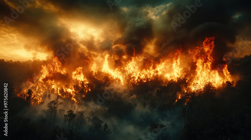 The wildfire blaze spreads uncontrollably through dry brush, creating a massive firestorm.