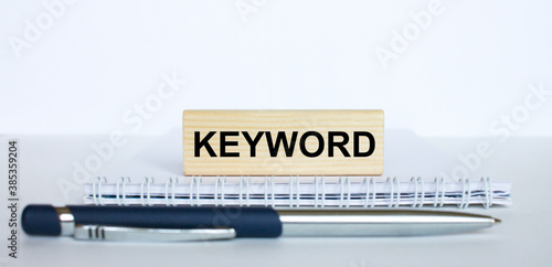The word Keyword on a bar of jenga wood, lying on a Notepad with a metal blue pen