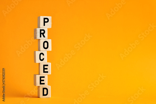 The word proceed on wooden cubes with yellow background. Proceeding in business or law.