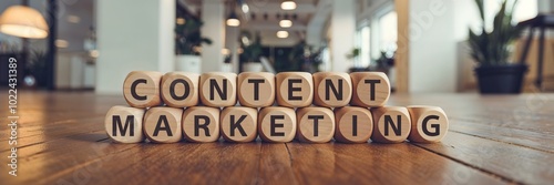 The words 'Content Marketing' spelled out in wooden blocks on a table in an office setting affiliate marketing concept