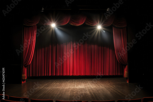 Theater stage with red curtains are opening with spotlight performance lights showing, generative AI