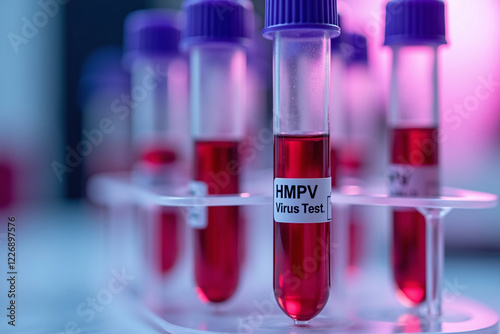 There are several test tubes with red liquid in a stand. In the foreground, one of the test tubes is highlighted and on it is a sticker with the text: "HMPV Virus Test".