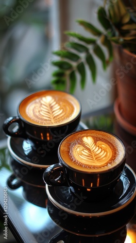 There are two cups of coffee on a table with a plant, drink background, vertical background