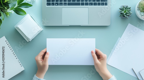 There are two hands holding a spuer long piece of paper on the clean desktop, with no other clutter around.
