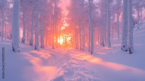 There is a beautiful sunrise surrounded by white trees and a pastel sky. Perfect for winter travel photography, the scene is peaceful and serene.