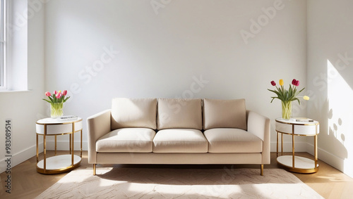 There is a beige modern sofa. White walls. It has a white side table with gold tones, a vase of flowers and tulips. There are no windows, and the room is very beautiful with sunlight coming in, making