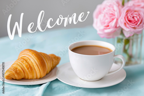 There is a croissant and one coffee cup on the cozy breakfast table, soft bright colors, and a bouquet of flowers.