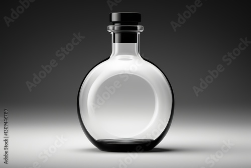 there is a glass bottle with a black lid on a table