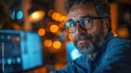 There is a man with glasses and a beard sitting in front of a computer, portrait