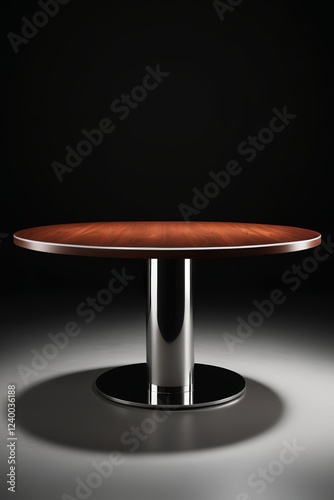 there is a round table with a wooden top and a metal base