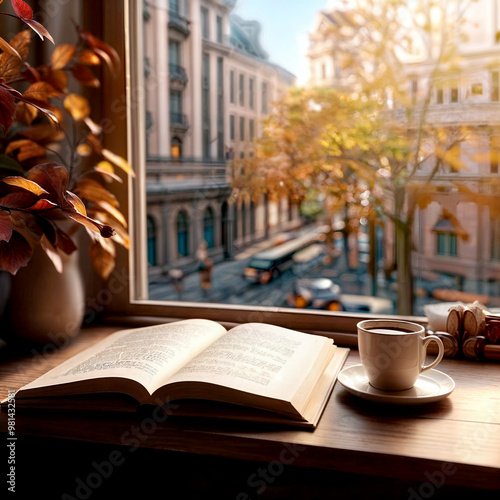 There is a view of autumn city out of the window that fills the walls of the cafe. A one cup of coffee and an open book on the table.