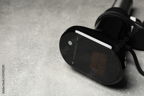 Thermal immersion circulator on light grey table, closeup view with space for text. Sous vide cooker