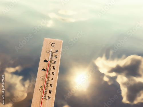 Thermometer showing 30 degrees of heat against the backdrop of lake water with the reflection of clouds and the sun