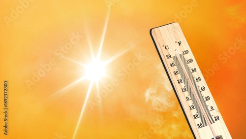 Thermometer with high temperature against orange sky background and shining sun. Heat wave concept. Extreme weather. Global warming effects