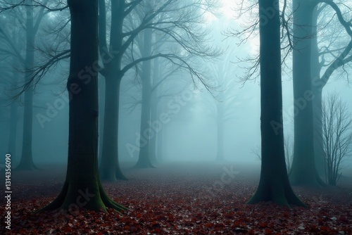 Thick fog weaves between slender tree trunks, creating ghostly shapes , photography, trees