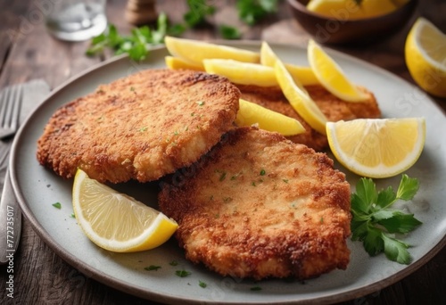 Thin, breaded and fried cutlets of meat, typically made with pork (Schweineschnitzel) or veal (Wiener Schnitzel), served with lemon wedges