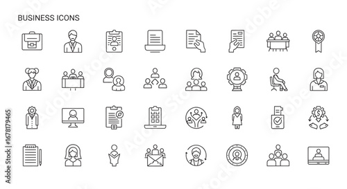 Thin line business symbols representing various office activities and employee interactions in a modern, minimalist style, conveying professionalism and efficiency.