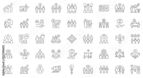 Thin Line Icons Depicting Business Teamwork and Financial Concepts