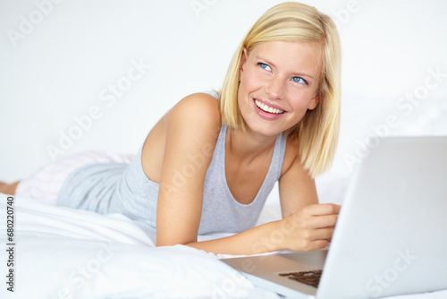 Thinking, home and woman with a laptop, ideas and planning with happiness, solution or website information. Person, apartment or girl with a pc, decision or typing with a choice, daydreaming or smile
