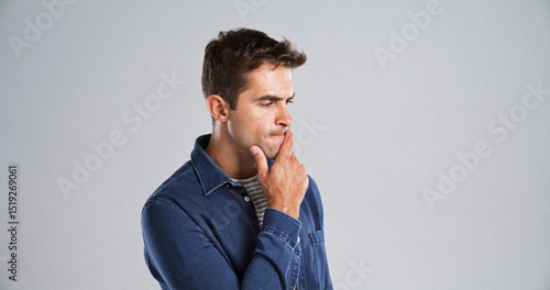Thinking, man and confused with doubt in studio for fake news, problem solving or brainstorming. Mockup space, puzzled and person contemplating with planning, solution and serious on gray background