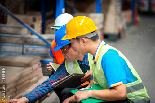Thinking, warehouse workers on tablet and clipboard for inspection, inventory online stock Manufacturing, distribution person on digital for logistics, maintenance and supply chain list in factory