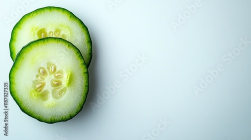 thinly sliced piece of fresh cucumber with visible seeds placed on clean white background with generous copy space