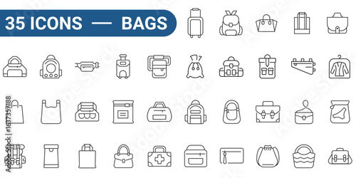 Thirty five line art bag icons suitable for fashion websites, shopping apps, and accessory product designs, showcasing various bag types. outline collection. editable stroke