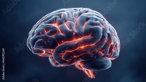 This 3d rendering shows a human brain with glowing neural connections on a blue background.