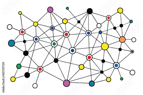 This abstract network design features colorful dots connected in a vibrant and geometric pattern, perfect for modern digital projects, tech designs, or creative backgrounds.