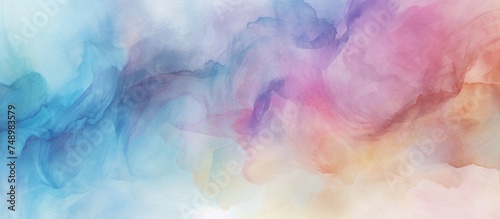 This abstract painting features a vibrant mix of blue, pink, and yellow hues, created through artistic brush strokes and watercolor washes. The colors blend beautifully, creating a dynamic backdrop