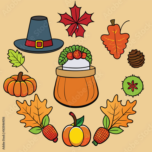 This autumn seamless pattern features a collection of pumpkins, leaves, and other fall harvest elements, perfect for a Thanksgiving background design