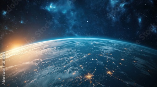This breathtaking view captures Earth from space, showcasing the blue oceans, cloud patterns, and glowing city lights as the sun rises on the horizon in a serene atmosphere