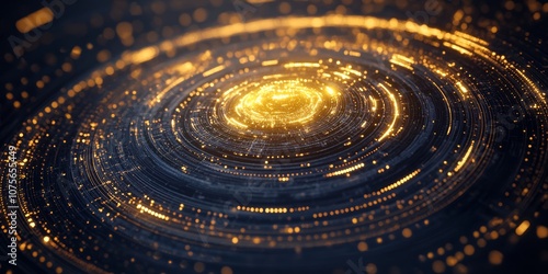 This captivating abstract image showcases the infinite connections of quantum physics through interlocking circular shapes and flowing lines, evoking a mesmerizing exploration of the cosmos