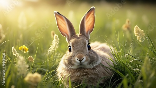 This captivating image captures a rabbit partially hidden in a sea of tall, lush grass. With only its ears and eyes peeking through the green blades, the photograph evokes a sense of curiosity