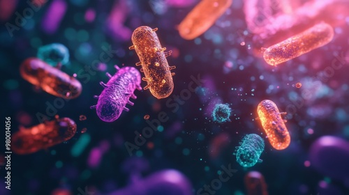 This captivating visual displays a variety of bacteria suspended in a dark background, illuminated by vibrant colors. The microbial forms exhibit intricate details and varying shapes.