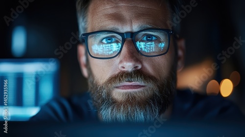 This close-up shot of a thoughtful man in glasses conveys deep focus and contemplation, highlighting the intersection of human emotion and technology in a modern setting.