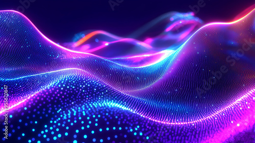 This design showcases an abstract neon purple wave background, featuring floating glowing dots and lines that create a futuristic, web-like wallpaper. The bright colored light emanates from the waves,