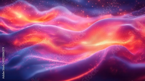 This digital artwork showcases vibrant, flowing abstract waves in shades of purple, orange, and pink against a starry background.
