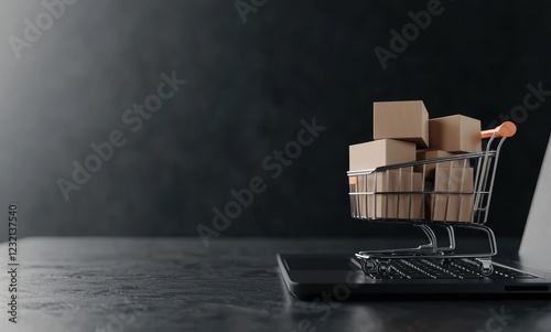 This high-fidelity 3D render showcases an online shopping concept featuring a miniature shopping cart filled with boxes, symbolizing modern e-commerce on a sleek desktop setting.