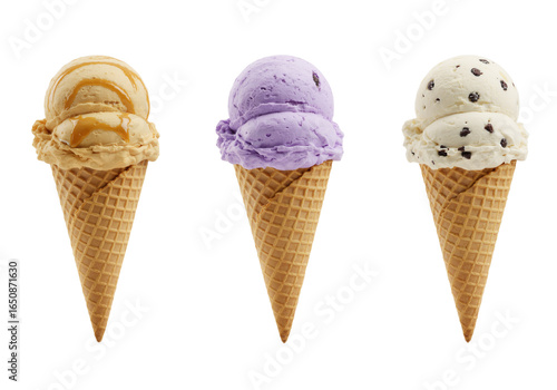 This high-resolution image showcases three classic waffle ice cream cones arranged in a clean, balanced row against a white background. Each cone features a perfectly scooped portion of premium ice cr