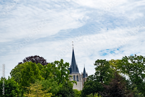 This image captures the majestic spire of a church in Mechelen, gracefully piercing the sky. The church tower, with its Gothic architectural elements, stands as a silent guardian over the lush green