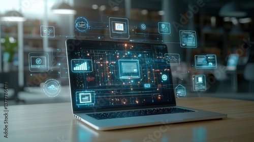 This image depicts an visualization of a futuristic digital interface showcasing the capabilities and potential of modern education technology