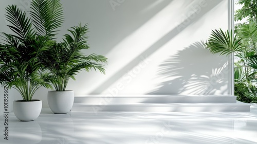 This image displays a naturally lit, minimalist interior adorned with twin potted plants, offering a tranquil and refreshing ambiance enhanced by shadows and light.