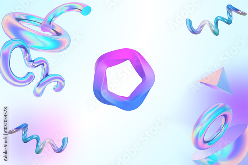 This image features a 3D abstract design with vibrant, metallic shapes in shades of purple, blue, and pink. Various twisted, spiral, and polygonal forms float on a light, gradient background.